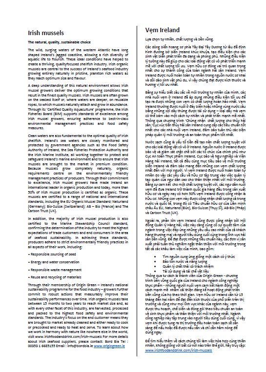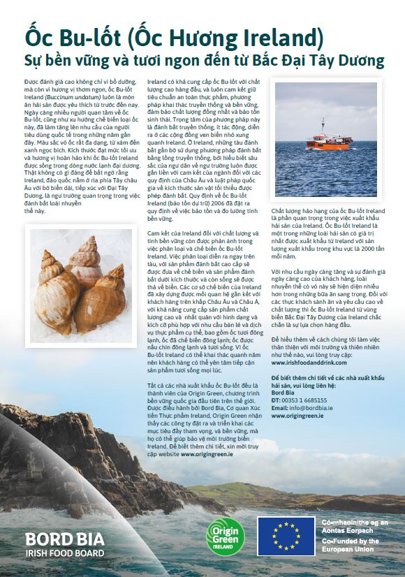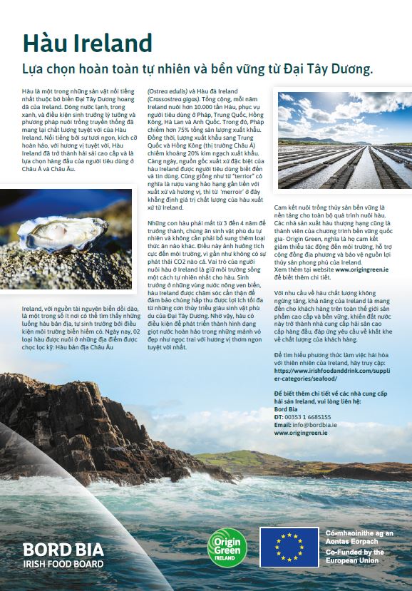 Bord Bia – Cơ quan Thực phẩm Ireland đóng một vai trò quan trọng trong việc thúc đẩy nhận thức về Ireland như một nguồn cung cấp hải sản cao cấp, chất lượng cao và bền vững thông qua việc truyền đạt lợi ích của hải sản Ireland cho người tiêu dùng quốc tế.